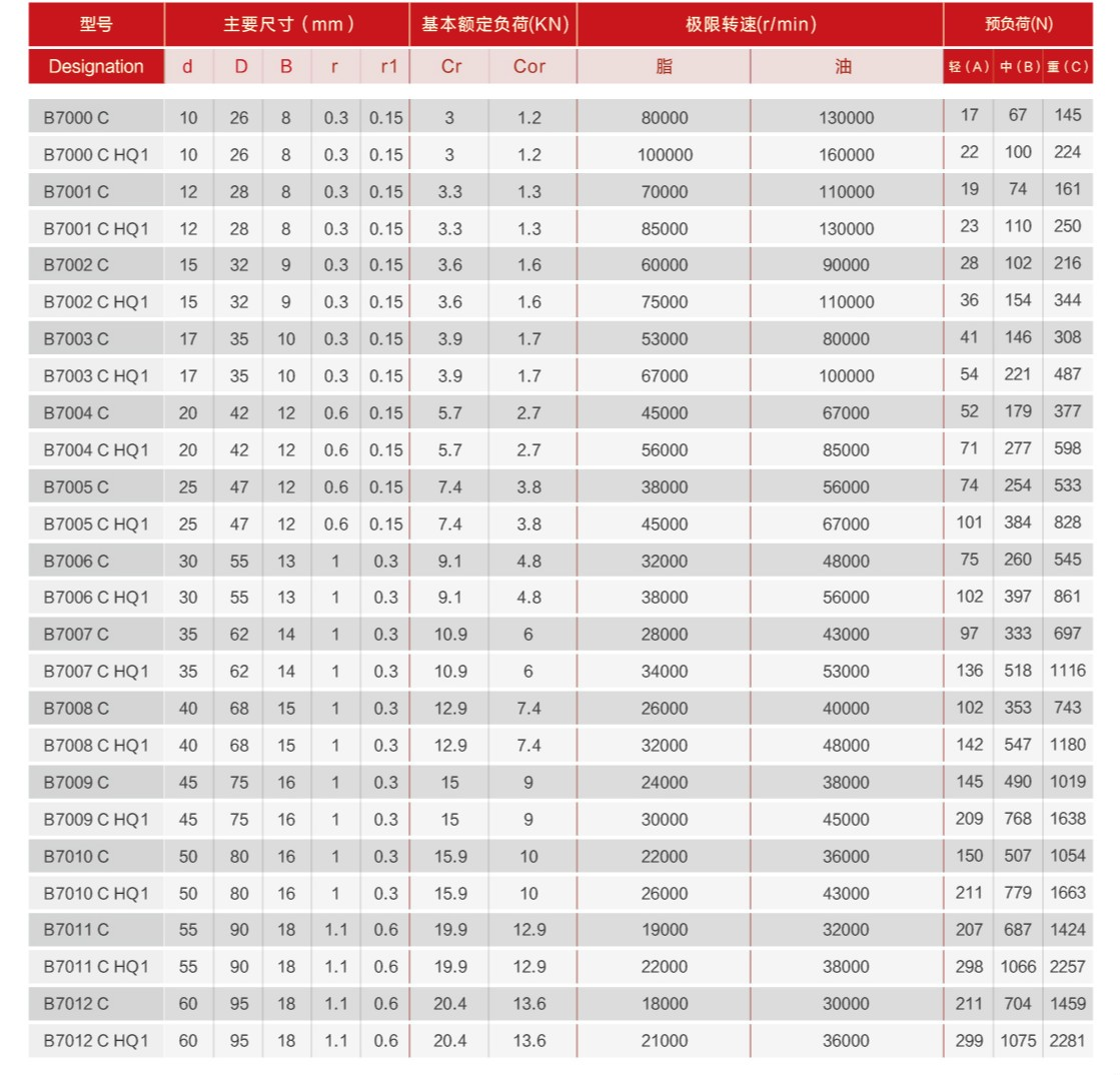| 7012C | 60 | 95 | 18 | 1.1 | 1.1 | 39 | 33.5 | 14000 | 22000 | 18000 | 30000 | 211 | 704 | 1459 | 0.45 |