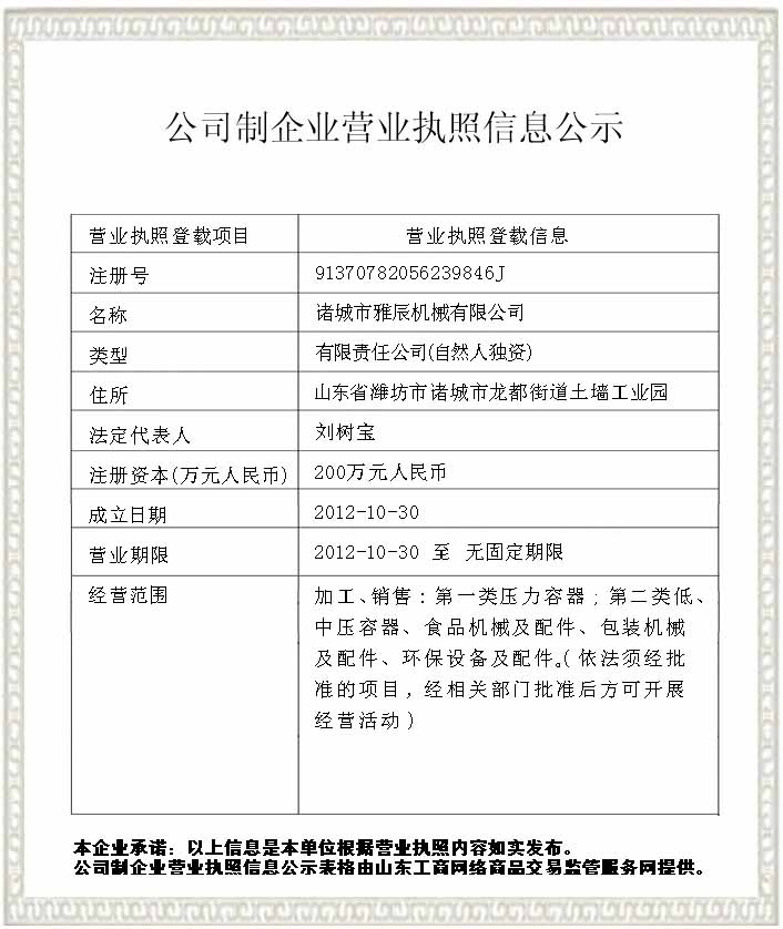 諸城市雅辰機(jī)械有限公司具有壓力容器(證書(shū)編號(hào):TS2237E79-2024)制造資質(zhì),主要生產(chǎn)制造各種夾層鍋、蒸煮鍋、鹵鍋、殺菌鍋、行星炒鍋、松香鍋、攪拌罐、食用菌滅菌罐、硫化罐等,是食品加工設(shè)備制造商。產(chǎn)品設(shè)備銷(xiāo)往全國(guó)多個(gè)省市、自治區(qū)及出口東南亞、中亞等多個(gè)地區(qū)。
